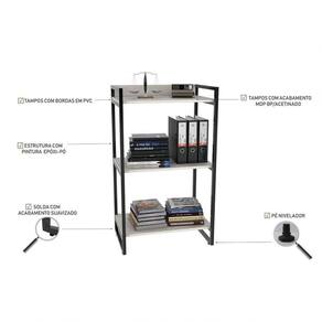Características do Produto Material da Estrutura: MDP BP 15 mm/Aço. Peso Suportado: 5 Kg por prateleira/ 30 Kg na mesa. Tonalidade: Snow. Acabamento: BP Acetinado e Pintura Epóxi. Escala de Brilho: Fosco. Possui Prateleiras: Sim. Material das Prateleiras: MDP. Possui Pés: Sim, Aço com pintura epóxi. Possui Rodízios: Não. Diferenciais: - Design moderno. - Fita de borda em PVC. - Pés niveladores. - Estrutura reforçada. Sistema de Montagem: Minifix / Cavilhas / Parafs. Manual de Montagem: Sim. Complexidade da Montagem: Baixa. Conteúdo da Embalagem: 1 Estante/1 Mesa. Volumes: 2 Volumes. Garantia do Fabricante: 3 meses contra defeito de fabricação. Montagem: Recomendamos que seja feita por um . Recomendação de Limpeza: Utilize pano levemente úmido.