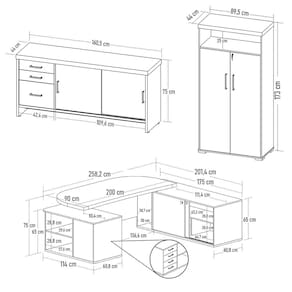 Conteúdo da Embalagem: 1 Mesa, 1 Balcão, 1 Armário Alto.