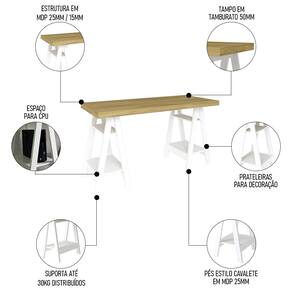 Um dos principais recursos dessa mesa cavalete é o tampo de tamburato de 50mm, que confere resistência e durabilidade. Já os pés cavalete em MDP de 25mm são responsáveis por conferir um visual moderno e diferenciado ao produto, dando aquele toque de personalidade ao ambiente.