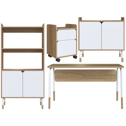 Conjunto Escritorio Home Office 4 Peças 279X88X98X96X97, foram inspirados no design orgânico e estilo contemporâneo, transformando seu ambiente de trabalho em um lugar leve e confortável. Possui estrutura em MDP de 25 mm e 15 mm, acabamento em pintura BP (fosco). Escrivaninha composta por amplo tampo com cantos arredondados, pés em tubo de aço com acabamento em pintura epóxi fosca, extremidades dos pés em madeira maciça de eucalipto com sapatas reguláveis. Gaveteiro com 2 gavetas com corrediças telescópicas, além de rodízios em nylon sendo 2 com trava e 2 sem trava. Armario alto composto por 2 portas com dobradiças metalicas com amortecimento, além de 3 prateleiras sendo 1 interna, pés em tubo de aço com acabamento em pintura epoxi fosca, extremidades dos pés em madeira maciça de eucalipto com sapatas regulaveis. Armario Baixo composto por tampo, 2 portas com dobradiças metálicas com amortecimento, prateleira interna, pés em tubo de aço com acabamento em pintura epóxi fosca, extremidades dos pés em madeira maciça de eucalipto com sapatas reguláveis. Estes móveis chegarão na sua casa separados em 4 volumes.