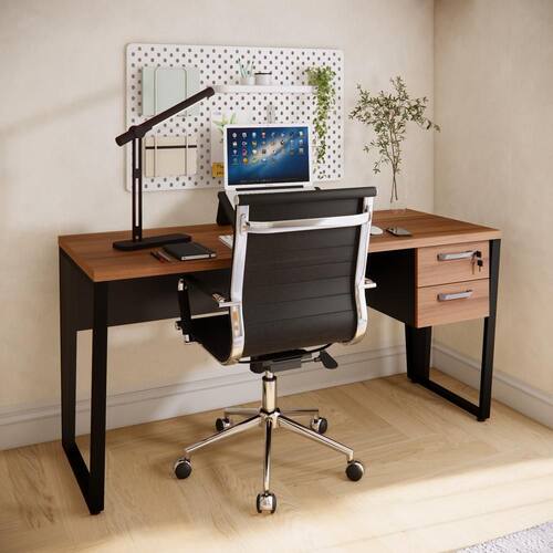 A mesa oferece uma área de trabalho ampla com estrutura metálica resistente, enquanto o gaveteiro proporciona segurança e organização com duas gavetas espaçosas e fechadura com chave.