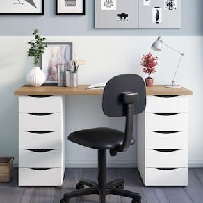 O conjunto contém uma escrivaninha e um gaveteiro, é perfeito para quem procura sofisticação e praticidade para ambientes com pouco espaço.