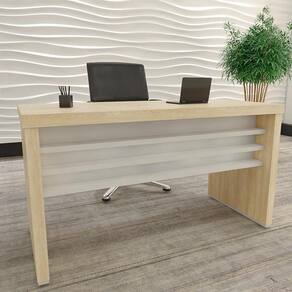 A mesa possui um design elegante com longarinas na traseira.