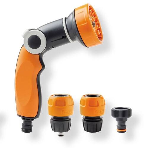 Conjunto Esguicho Regulável 8 Funções, Engate 1/2 E Adaptador 3/4 Gf80005594 Conjunto de irrigação de jardim contendo esguicho regulável com 8 tipos de jato de água, adaptador de engate rápido macho com rosca fêmea de 3/4 para conectar em torneiras com rosca de 3/4, ngate rápido fêmea para mangueira de 1/2 e 5/8 e engate rápido fêmea para mangueira de 1/2 e 5/8 com válvula automática de retenção.Fabricado na Itália. Marca: Não Informado Ean: 8004779023507