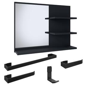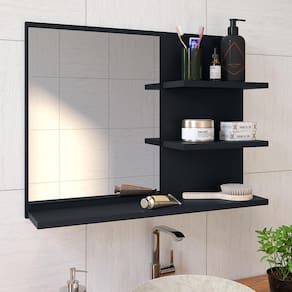 A espelheira Astra apresenta um design minimalista, contendo prateleiras na lateral e parte inferior podendo ser utilizadas para acomodar itens de uso diário ou objetos decorativos