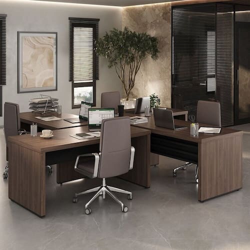 Fabricadas em tamburato de alta resistência, estas mesas são ideais para suportar o ritmo acelerado do dia a dia, garantindo ao mesmo tempo um ambiente organizado e profissional. Com um design pensado para otimizar o espaço e facilitar a colaboração entre equipes, este conjunto proporciona flexibilidade na disposição das mesas, adaptando-se perfeitamente às necessidades operacionais de sua empresa.