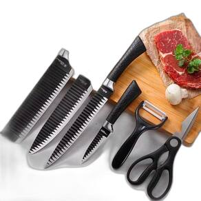 Especificações Técnicas: - Material: Aço inox - Revestimento antiaderente - Cabo ergonômico - Tesoura com múltiplas funções - Cortador de legumes e frutas com lâmina de cerâmica - Itens inclusos: 1 cutelo de 7 17.8cm , 1 faca de carne de 8 20cm , 1 faca para pão de 8 20cm , 1 faca para vegetais de 3 9cm , 1 tesoura de cozinha 13cm , 1 descascador de legumes 15cm , 1 estojo para guardar utensílios - Recomendações: Manter a faca sempre afiada e seca. Resistente ao uso em máquina de lavar. Produto cortante e perfurante. Manter fora do alcance das crianças. - Cuidados: Lavar com detergente neutro e enxaguar com água limpa em abundância. Para secar, utilizar um pano seco e macio. Evitar o uso de produtos abrasivos. Marca: Relet