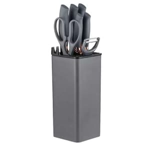 1 Faca de Chef 1 Faca de Pão 1 Faca de Cozinha 1 Faca de Frutas 1 Faca de Tomate 1 Tesoura Multifuncional 1 Descascador 1 Cepo com Afiador de Facas