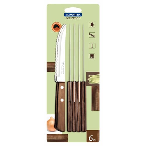 Conjunto Facas Churrasco 6 Peças Polywood Tramontina 21100695 As refeições informais não dispensam a qualidade dos talheres, utensílios e facas. Por isso, a Linha Polywood têm lâminas de aço inox em formato e espessura que garantem a resistência e evitam deformações. O tratamento térmico dá mais durabilidade ao fio e o cabo de madeira tratada polywood, fixado com rebites de alumínio, é confortável à pega. Com cinco anos de garantia, permanecem bonitos mesmo com uso intenso e submetidos a impactos e altas temperaturas. Podem ir à máquina de lavar louças.