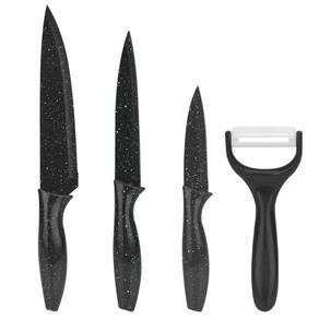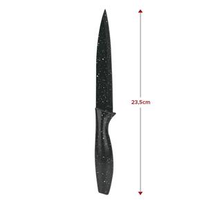 As facas são feitas com lâminas de aço inox, garantindo precisão nos cortes. O conjunto é composto por 4 facas vibrantes e um prático descascador de legumes.