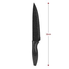 A faca do chef possui uma medida total de 32 cm, a faca para desossar possui medida total de 23,5 cm e a faca para legumes possui medida total de 20 cm. O descascador de legumes tem uma lâmina de cerâmica e medida total de 15 cm.