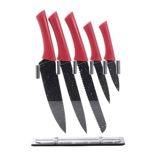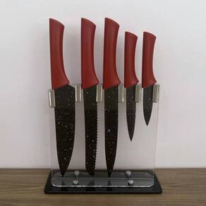 Conjunto De Facas com Suporte Gourmet - Vermelho Inox/Acrílico 6pç - Wincy Conjunto De Facas com Suporte Gourmet - Vermelho Inox/Acrílico 6pç - Wincy O conjunto de facas é o que faltava para deixar sua cozinha ainda mais bonita e moderna. Ele conta com um suporte para que você consiga deixar sua cozinha mais organizada. Caracteristicas do Produto: - Composição: Inox, polipropileno e acrílico; - Conteúdo: 1 Suporte e 5 facas; - Cor: Vermelho. Dimensões: - Suporte 23cm x 21cm; - 01 Faca do Chef 8 32cm x 4,2cm; - 01 Faca de pão 32cm x 2,8cm; - 01 Faca 8 32cm x 2,8cm; - 01 Faca para utilidades 21cm x 02cm; - 01 Faca para descascar 18cm x 02cm. 3 meses com o fabricante. Imagens meramente ilustrativas. Marca: Não Informado