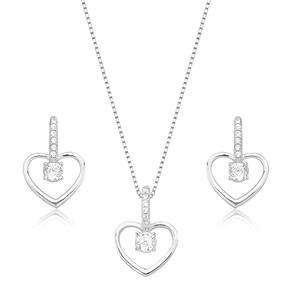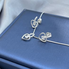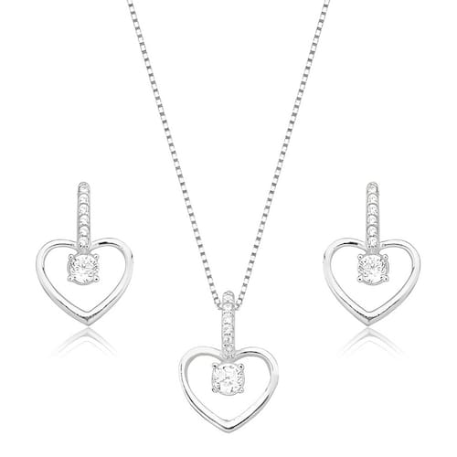 Este conjunto delicado e sofisticado é composto por um colar e brincos, ambos com pingentes em formato de coração vazado. No centro de cada coração, há uma pedra brilhante que adiciona um toque de elegância e brilho à peça. O detalhe adicional de pequenas pedras na parte superior dos pingentes proporciona um charme extra, tornando o design ainda mais refinado.