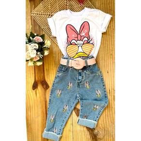 Blusa T-shirt com estampa na parte frontal, calça jeans com bordado na parte frontal, elástico cintura ajustável, fechamento em botão e ziper.