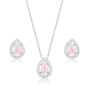 Este conjunto é composto por um colar e um par de brincos, ambos exibindo um design harmonioso e sofisticado. O pingente e os brincos possuem o mesmo formato de gota, cada um adornado com uma pedra central rosa claro, cuidadosamente lapidada, que é envolvida por uma moldura cravejada de pequenas pedras brilhantes, criando um efeito cintilante.