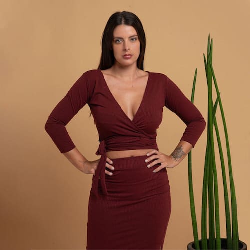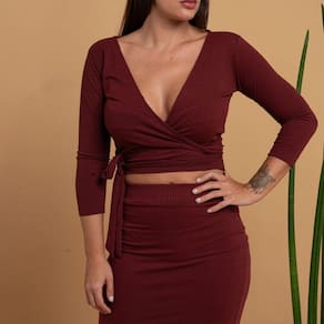 CONJUNTO CROPPED ENVELOPE E SAIA MIDI Somos fabricantes e garantimos a qualidade do nosso tecido e da nossa costura em todos os detalhes. Todas as peças são revisadas antes de serem enviadas. Tecido: Canelado Premium, que estica muito, se ajustando ao corpo. Ele tem toque de algodão, com ultraconforto, que não desbota, não dá bolinhas e não encolhe. A BLUSA CROPPED envelope tem um design único e super versátil, pois ela pode ser amarrada de várias formas diferentes no corpo. O seu decote em v, pode ficar na frente (alongando a silhueta e valorizando o colo) ou nas costas, se tornando um decote canoa na frente, tornando a peça mais discreta, sem abrir mão da elegância. Além dessas duas formas de amarrar mais básicas, citadas acima, a blusa transpasse pode ser amarrada como top mais curto, dando duas voltas nas tiras, na parte da frente e também com um único laço frontal. Use a criatividade com essa peça chave, para um armário mais inteligente, cheio de opções de looks, em um só modelo de blusa. Comprimento das mangas: Midi – 3/4. Detalhes: Gola em V ou canoa, depende da forma que ela é amarrada no corpo; Mangas ajustadas, que dão equilíbrio a diversas combinações de looks; Barra com tiras de amarrar, reguláveis, possibilitando diversas formas de uso. A SAIA LÁPIS com fenda lateral é uma peça de roupa versátil que combina perfeitamente com diversas ocasiões e estilos. Elaborada com um design contemporâneo, a saia lápis possui uma modelagem mais ajustada, que valoriza as curvas femininas de forma elegante. Comprimento: Midi/alongado (Na altura da metade da panturrilha) dependendo da sua altura. Detalhes: Elástico confortável e seguro na cintura; Fenda lateral; Modelagem reta.
