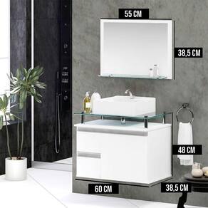 O Gabinete Diamante com cuba elegante é a escolha ideal para transformar seu banheiro! Com uma espelheira no topo, duas gavetas e uma porta, ele oferece praticidade e estilo, deixando seu ambiente organizado e sofisticado.