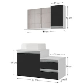 Medidas gabinete: 80cm x 40cm x 47 (comp. / prof. / altura)Medidas da pia sobrepor : 34x34x11Medidas Espelheira : 80cm x 40cm x 14cm (comp. / altura / prof)