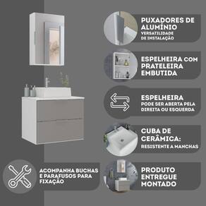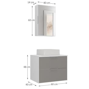 Modelo moderno, com puxador de alumínio.Medidas gabinete: 60cm x 40cm x 47 (comp. / prof. / altura)Medidas da pia sobrepor : 34x34x11Medidas Espelheira : 60cm x 40cm x 14cm (comp. / altura / prof)