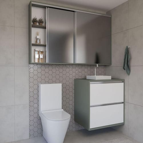 Conjunto Gabinete E Espelheira Plena Versati 70cm Verde Branco Conjunto Gabinete e Espelheira Plena Versati 70cm Verde Branco - Versatilidade e sofisticação se encontram no Plena Versati 70. Este conjunto de sobrepor combina a qualidade premium da linha Plena com um design diferenciado. Apresenta um balcão compacto (70cm alt x 70cm larg x 45cm prof) e uma espelheira ampla e marcante (90cm alt x 130cm larg x 17cm prof), criando um ponto focal de elegância no seu banheiro. Ideal para quem busca um toque único de design e qualidade superior.