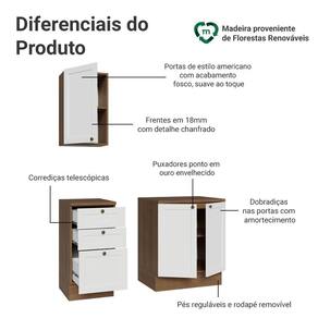 Com estrutura no tom amadeirado Rustic e frentes em Branco, o acabamento é de alta resistência e possui textura suave ao toque, garantindo durabilidade por muito mais tempo. O destaque fica por conta dos puxadores ponto em ouro envelhecido, feitos em metal resistente, que adicionam personalidade e um charme único. O detalhe chanfrado das frentes forma molduras elegantes, inspiradas no estilo americano com um toque moderno.