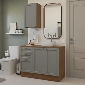 A composição inclui um balcão com três gavetas e duas portas, além de um armário aéreo com uma porta, ideal para manter o ambiente sempre organizado, com espaço para produtos de higiene, toalhas ou itens decorativos.