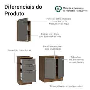 Com estrutura no tom amadeirado Rustic e frentes em Cinza, o acabamento é de alta resistência e possui textura suave ao toque, garantindo durabilidade por muito mais tempo. O destaque fica por conta dos puxadores ponto em ouro envelhecido, feitos em metal resistente, que adicionam personalidade e um charme único. O detalhe chanfrado das frentes forma molduras elegantes, inspiradas no estilo americano com um toque moderno.