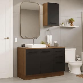 A composição inclui um balcão com três gavetas e duas portas, além de um armário aéreo com uma porta, ideal para manter o ambiente sempre organizado, com espaço para produtos de higiene, toalhas ou itens decorativos.