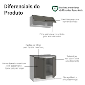 A composição inclui um balcão de 80 cm com duas portas e um armário aéreo de 80 cm com uma porta basculante. A porta basculante possui pistão, que mantém a porta suspensa enquanto está aberta, oferecendo mais conforto e segurança no uso diário.