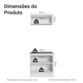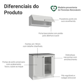 A composição inclui um balcão de 80 cm com duas portas e um armário aéreo de 80 cm com uma porta basculante. A porta basculante possui pistão, que mantém a porta suspensa enquanto está aberta, oferecendo mais conforto e segurança no uso diário.