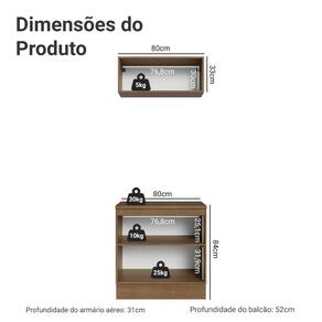 A composição inclui um balcão de 80 cm com duas portas e um armário aéreo de 80 cm com uma porta basculante. A porta basculante possui pistão, que mantém a porta suspensa enquanto está aberta, oferecendo mais conforto e segurança no uso diário.