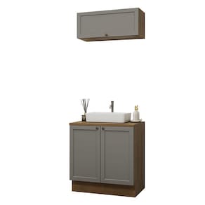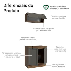 Com estrutura no tom amadeirado Rustic e frentes em Cinza, o acabamento é de alta resistência e possui textura suave ao toque, garantindo durabilidade por muito mais tempo. O destaque fica por conta dos puxadores ponto em ouro envelhecido, feitos em metal resistente, que adicionam personalidade e um charme único. O detalhe chanfrado das frentes forma molduras elegantes, inspiradas no estilo americano com um toque moderno.