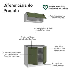 Com estrutura em Branco e frentes em Verde, o acabamento é de alta resistência e possui textura suave ao toque, garantindo durabilidade por muito mais tempo. O destaque fica por conta dos puxadores ponto em ouro envelhecido, feitos em metal resistente, que adicionam personalidade e um charme único. O detalhe chanfrado das frentes forma molduras elegantes, inspiradas no estilo americano com um toque moderno.