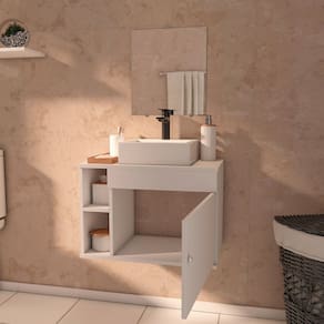 Beleza, praticidade e funcionalidade para seu banheiro! Este gabinete de 60cm conta com design moderno e compacto, ideal para banheiros e lavabos com espaço reduzido. Acompanha cuba em mármore sintético, material resistente, de fácil limpeza e com acabamento sofisticado.
