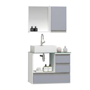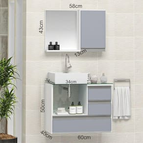 Modelo moderno, com puxador de alumínio tipo perfil. (móveis iguais sob medida)Medidas gabinete: 60cm x 40cm x 50 (comp. / prof. / altura)Medidas da pia sobrepor : 34x34x11Medidas Espelheira : 60cm x 40cm x 14cm (comp. / altura / prof)Medida Tampo Vidro: 60cm x 40cm com 6mm de espessura (vidro temperado)