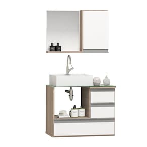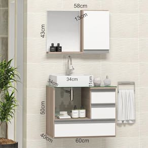 Modelo moderno, com puxador de alumínio tipo perfil. (móveis iguais sob medida)Medidas gabinete: 60cm x 40cm x 50 (comp. / prof. / altura)Medidas da pia sobrepor : 34x34x11Medidas Espelheira : 60cm x 40cm x 14cm (comp. / altura / prof)Medida Tampo Vidro: 60cm x 40cm com 6mm de espessura (vidro temperado)