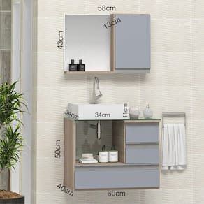 Modelo moderno, com puxador de alumínio tipo perfil. (móveis iguais sob medida)Medidas gabinete: 60cm x 40cm x 50 (comp. / prof. / altura)Medidas da pia sobrepor : 34x34x11Medidas Espelheira : 60cm x 40cm x 14cm (comp. / altura / prof)Medida Tampo Vidro: 60cm x 40cm com 6mm de espessura (vidro temperado)