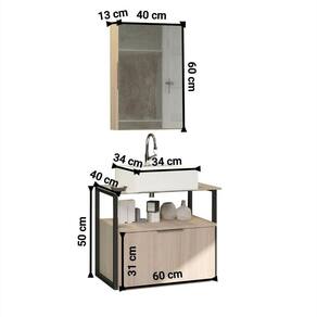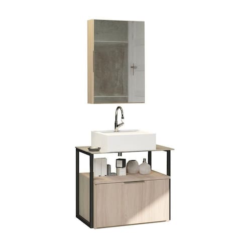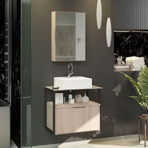 KIT BANHEIRO ESTILO INDUSTRIAL COMPLETO 60cmGABINETE MADEIRA + FERRAGENS PRETAS + CUBA + ESPELHEIRA + TAMPO VIDRO