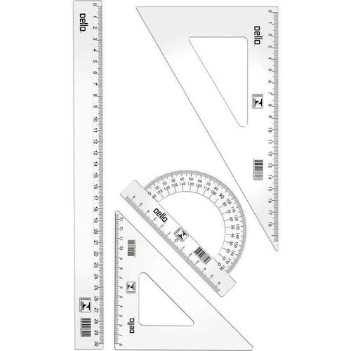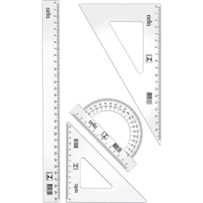O destaque deste conjunto é a régua de 30cm, que permite traçar linhas retas com facilidade e precisão. Além disso, o conjunto inclui um transferidor de 180º, ideal para medir e traçar ângulos, e dois esquadros, um de 45º e outro de 60º, que são essenciais para criar formas geométricas.
