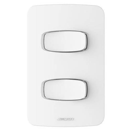 Conjunto Gracia 4X2 2 Interruptor Simples Horizontal Alumbra - Produto com design inovador, ideal para suas instalações elétricas. - possui suporte com regulagem, permitindo perfeito ajuste do conjunto à parede. - Fabricados em termoplástico de engenharia com alto brilho com aditivo auto extinguível e proteção contra raios UV. Material: Materiais plásticos partes isolantes e ligas metálicas. voltagem: 250 v Conteúdo: 1- placa 4x2 2- interruptores simples - cor: branco Ean: 7896565853242
