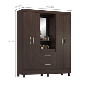 O guarda roupa é feito em MDP. Possui 2 gavetas com corrediça telescópicas, 4 portas, 2 cabideiros, 3 prateleiras, 3 nichos e 1 espelho.