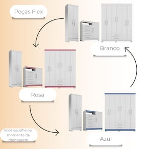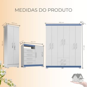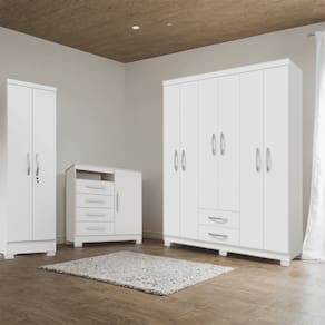 A cômoda traz ainda mais funcionalidade, com quatro gavetas e uma porta lateral que inclui nicho e tampo, podendo ser usada também como rack para TV de até 39". Já o armário multiuso é a peça ideal para armazenar desde roupas e acessórios até documentos e objetos diversos, com prateleiras removíveis e fechadura para maior segurança.