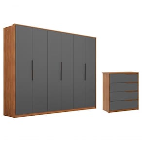Conjunto Guarda Roupa Grande Com Cômoda, com qualidade em todos os detalhes, com muito espaço e compartimentos ideais para acomodar todas as suas coisas, desde as roupas até os sapatos e acessórios, possui estrutura em MDP de 12mm e 15mm, acabamento em pintura UV (Fosco). Roupeiro equipado com 06 portas articuladas com dobradiças metálicas, os puxadores perfil em alumínio possuem sutileza no desenho e são modernos e discretos, conta com 06 gavetas internas com corrediças telescópicas que garantem um fechamento super suave, prateleiras internas com muito espaço para suas roupas, maleiros espaçoso, cabideiros metálicos sendo 1 para roupas longas, espaço ELE/ELA, nichos inferiores ideiais para sapatos, a Cômoda possui 04 gavetas com corrediças telescópicas que favorecem o manuseio e proporciona um fechamento leve e perfeito, puxadores em angulo cavados garante praticidade além de muito estilo, o visual moderno deste conjunto oferece sofisticação e bom gosto para a decoração do seu espaço. Estes móveis chegarão em sua casa separados em 06 volumes.