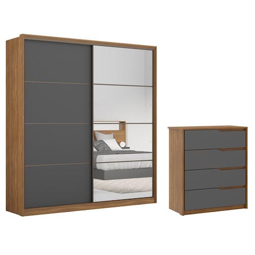 Conjunto Guarda Roupa Com Cômoda, imponente veio pra trazer beleza e grande capacidade de acomodação e organização para roupas e pertences, possui estrutura em MDP de 12mm e 15mm, acabamento em pintura UV (Fosco). Roupeiro equipado com 02 portas de correr com trilhos superior e inferior em alumínio, com movimentos de abre e fecha suave e com muito mais durabilidade, conta com espelhos em uma porta trazendo um visual mais sofisticado, sistema de cores flex, você tem duas opções de cores para escolher na hora da montagem, conta com 03 gavetas internas com corrediças telescópicas que garantem um fechamento super leve e suave, puxadores moderno em alumínio com acabamento na cor bronze, divisórias internas estilo colméia com muito espaço para seus pertences, maleiros espaçoso, cabideiros e calceiros em aluminio com espaço para roupas longas, nichos inferiores ideais para sapatos, a Cômoda possui 04 gavetas com corrediças telescópicas que favorecem o manuseio e proporciona um fechamento leve e perfeito, puxadores em angulo cavados garante praticidade além de muito estilo, o visual moderno deste conjunto oferece sofisticação e bom gosto para a decoração do seu espaço. Estes móveis chegarão em sua casa separados em 06 volumes.