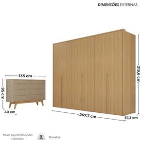 O Conjunto Roupeiro Lizz 6 Portas Cômoda Vicenza 8 Gavetas é ideal para quem busca organização, resistência e design moderno para o quarto. Produzido em 100% MDF de 1,5cm, oferece alta durabilidade, ótimo acabamento e excelente aproveitamento de espaço. Medidas: Guarda-roupa 219,6x267,7x57,3 cm; cômoda 135x95x40 cm.