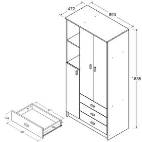 O guarda-roupa possui 3 portas, 3 gavetas, 1 prateleira resistente e um cabideiro, oferecendo muito espaço para roupas e acessórios. Além disso, é resistente e tem um visual moderno.