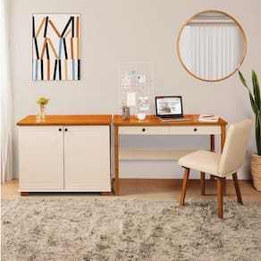 A linha Ananda é uma linha de escritório no estilo clássico, com priorização de funcionalidade e a possibilidade do cliente em montar um ambiente de trabalho com estilo e elegância. Conta com 1 Escrivaninha 120cm com 2 Gavetas e 1 Armário Baixo com 2 Portas. Altura do Conjunto: 77.3 cm Ambiente: null Ambiente Principal: Escritório Cor: Off White/Mel Informação Complementar: 1x Escrivaninha 120cm 2 Gavetas Tampo Pés em Madeira Maciça Ananda Off-white/Mel Largura: 120 cm Altura: 77,3 cm Peso: 23 kg Profundidade: 50 cm Necessita Montagem: Sim