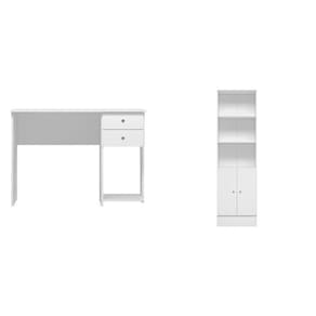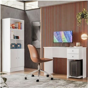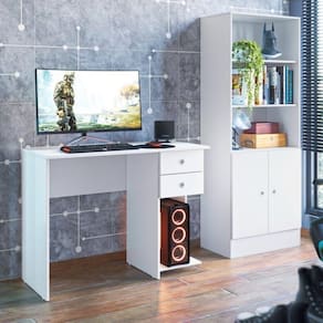 A Mesa Escrivaninha foi desenvolvida para completar seu escritório ou ambiente de estudo. Possui design compacto e ergonômico, que ajuda na otimização do espaço e promove o conforto necessário para acompanhar os momentos de trabalho e aprendizado. Possui uma prateleira elevada para o CPU e duas gavetas para marromhor organizar seus objetos. O Armário Gamer foi desenhado para decorar e organizar seus objetos de maneira moderna e funcional. Seu design compacto, é perfeito para ambientes menores que precisam de otimização do espaço. O produto faz combinação perfeita com a Mesa Escrivaninha Qmovi. Acabamento: Pintura UV Altura do Conjunto: 158.5 cm Ambiente: null Ambiente Principal: Escritório Cor: Branco Informação Complementar: 1x Escrivaninha 100cm 2 Gavetas BrancoLargura: 100Altura: 75Peso: 19.5Profundidade: 45Necessita Montagem: Sim1x Armário Gamer 2 Portas 5 Prateleiras BrancoLargura: 61Altura: 158.5Peso: 25Profundidade: 35.4Necessita Montagem: Sim Material Principal: MDP Tamanho: