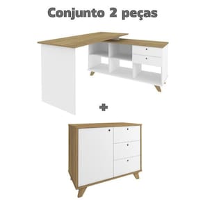 Crie um espaço de trabalho ou estudo belo e funcional com este lindo conjunto! Com uma mesa em L e um balcão com um charmoso design retrô, seu home office ou escritório ficará muito mais agradável e aconchegante! A escrivaninha é super espaçosa, oferecendo uma ampla superfície para trabalhar e organizar seus itens mais essenciais, além de decorações e livros. Já o balcão é perfeito para armazenar muitos materiais e ainda apoiar equipamentos, como impressoras e máquina de café. Em uma harmônica combinação de cores, junto ao charme dos pés em ângulo e delicados puxadores, seu ambiente ficará lindo e encantador! Feito em MDP de alta qualidade com acabamento BP, que garantem durabilidade e muita resistência ao uso diário. Acabamento: BP Possui Rodízio: Não Altura do Conjunto: 75.3 cm Ambiente: null Ambiente Principal: Escritório Cor: Olmo/Branco Informação Complementar: 1x Escrivaninha em L Retrô para Escritório Gold Branco/OlmoAltura: 75 cmPeso: 49 kgProfundidade: 60 cmNecessita Montagem: Sim1x Balcão Retrô para Escritório1 Porta 3 Gavetas Lugano Olmo/BrancoLargura: 90,5 cmAltura: 75,3 cmPeso: 36 kgProfundidade: 45,4 cmNecessita Montagem: Sim Material Principal: MDP