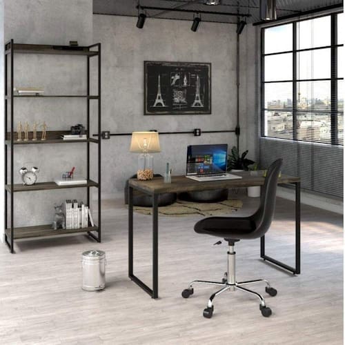 A linha Kuadra tem seu design com inspiração no estilo industrial, que remete muito a decoração utilizada nos lofts das grandes metrópoles nos anos 60 e 70. Harmonizando o metal e os tons de madeira, foram projetados móveis versáteis e com estilo, que podem compor ambientes flexíveis cheios de personalidade, perfeitos para você decorar sua casa ou seu trabalho, tendo um resultado que caminha do estilo rústico ao moderno. Suas estruturas são fabricadas em aço, com soldas suavizadas e pintura texturizada epóxi-pó. Conta com pés niveladores de altura e parafusos na Cr preta. Para os tampos são utilizados MDP-BP acetinado com fitas de borda em PVC, dando uma maior durabilidade ao seu móvel. Acompanha 1 Estante Multiuso 5 Prateleiras 187cmx80cm e uma mesa para Escritório Office 120cm. Cr: Informação Complementar: 1x Mesa para Escritório Office Estilo Industrial 120cm Kuadra Carvalho Dark Largura: 120 cm Altura: 75 cm Peso: 13,7 kg Profundidade: 60 cm Necessita Montagem: Sim1x Estante Multiuso 5 Prateleiras 187cmx80cm Industrial Kuadra Carvalho Dark Largura: 80 cm Altura: 187 cm Peso: 22,43 kg Profundidade: 40 cm Necessita Montagem: Sim Possui Portas: Não Possui Rodízio: Não Tamanho:
